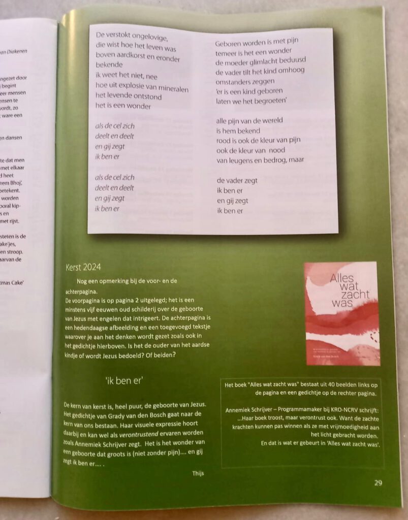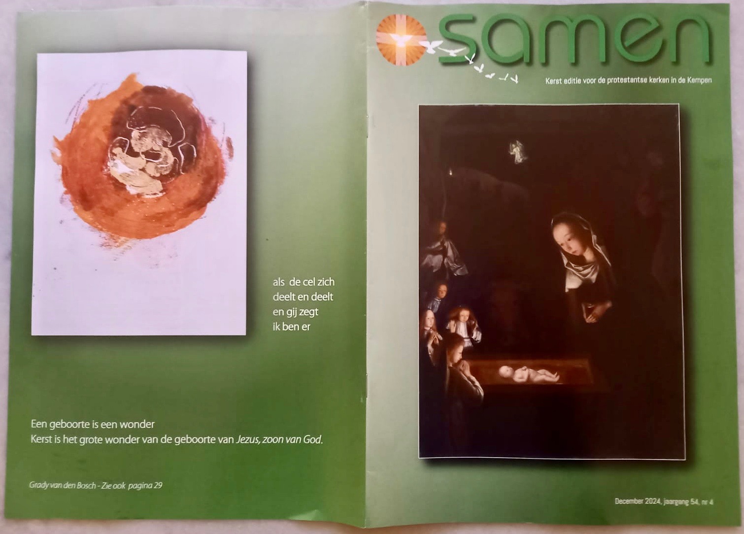 Voor de tweede keer publiceerde het blad Samen een tweeluik uit Alles wat zacht was. Deze keer het tweeluik met het kortste gedicht uit het boek, over de cel die deelt. Deze publicatie was in het kerstnummer van 2024, waarin naast het oorspronkelijke tweeluik in beeld en tekst, ook een nieuw gedicht was geschreven met mijn gedicht erin verwerkt.