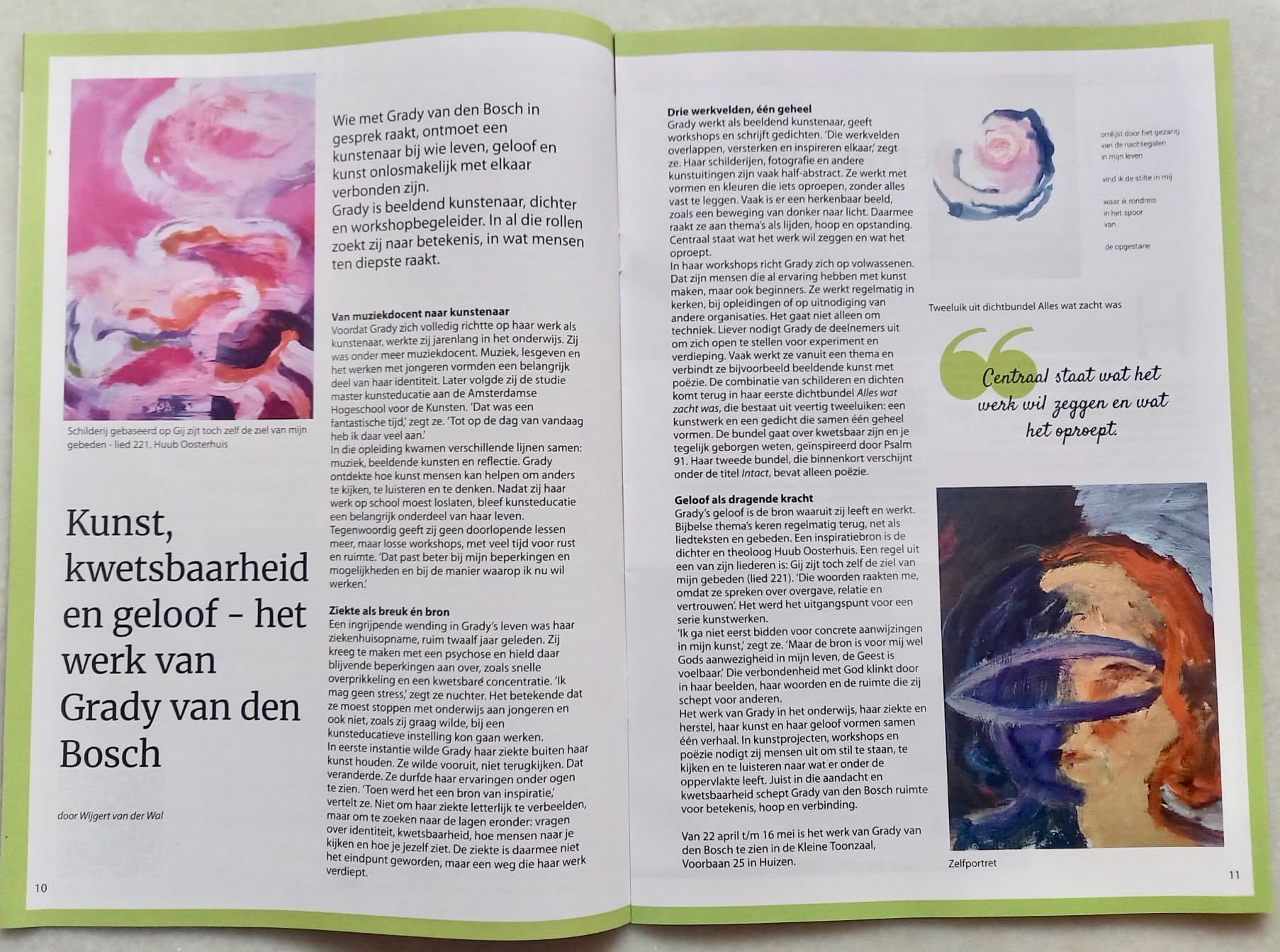 Voor het nieuwe full color magazine Verbinding, van de Protestantse Gemeente Huizen, werd ik geïnterviewd over mijn werk als kunstenaar, kunsteducator en dichter.