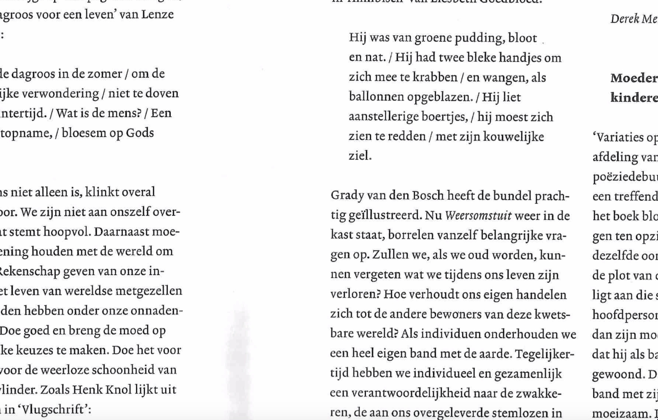 Ook een recensie in het literair magazine Liter over Weersomstuit. Hierin wordt expliciet het artwork geprezen: Grady van den Bosch heeft de bundel prachtig geïllustreerd.