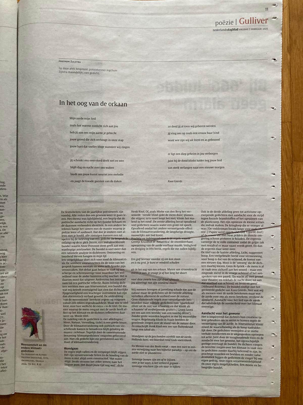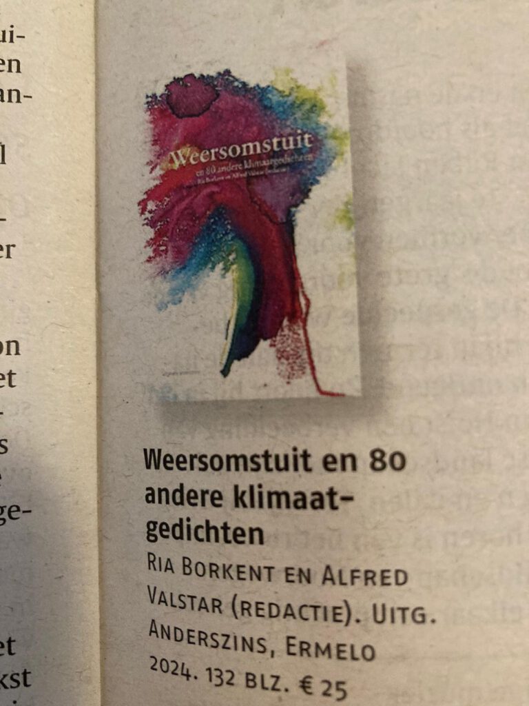 Voor de samengestelde dichtbundel Weersomstuit en 80 andere klimaatgedichten, maakte ik het artwork. Het beeld voor de cover en 5 zwartwit-illustraties voor het binnenwerk. Er verscheen een paginagrote recensie van de bundel in het Nederlands Dagblad. Ze noemden het o.a. een mooie bundel.