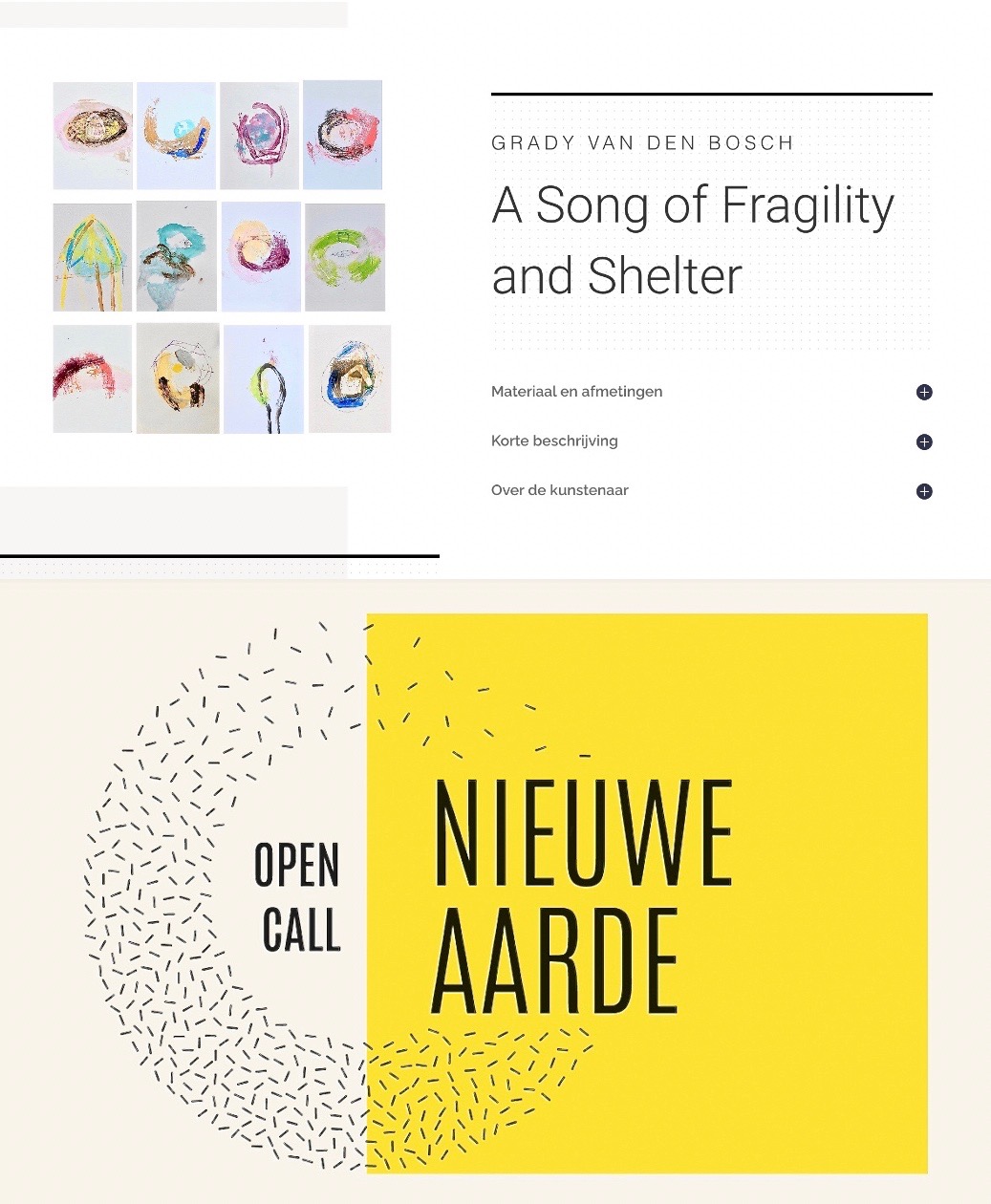 Een verzameling van 12 monoprints vormden samen de inzending A song of Fragility and Shelter. Dit werd één van de ca 90 geselecteerden, uit enkele honderden inzendingen.