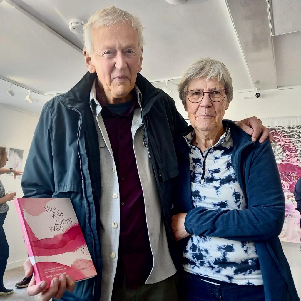 Alles wat zacht was is o.a. te koop in Galerie De Kleine Toonzaal in Huizen. In april en mei 2026 heb ik daar een duo-expositie. Bij de opening van de expositie waren er bijzondere bezoekers, namelijk mijn voormalig leidinggevende op de school waar ik lang heb gewerkt. Hij is inmiddels al lang gepensioneerd. Nu was hij er met zijn vrouw, die ik ook nog wel kende. Hij zei: ik koop geen kunst van je, maar ik wil wel je boek kopen. En zo geschiedde. Ik schreef er op zijn verzoek nog iets in en natuurlijk vroeg ik hem even met het boek te poseren. Bijzonder moment.